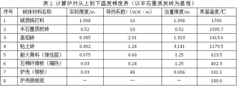 1.1 保溫型爐襯砌筑 高碳錳鐵礦熱爐其冶煉去溫度分布:在三根電極端部為氣體,將周?chē)虘B(tài)物料燒結(jié)熔氣化,形成空腔狀坩堝,空腔內(nèi)溫度高達(dá)2000~3000℃,坩堝壁熱面約1700~2000℃,冷面約1400~1700℃,坩堝外固態(tài)物料直至爐襯內(nèi)壁(保溫型爐襯)為1300~1600℃ 30MVA矮煙罩礦熱爐采用整體保溫爐襯砌筑技術(shù),其筑爐主要用料如下表1,計(jì)算爐襯從上到下溫度梯度如表2所示