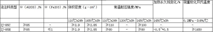 從耐火材料的使用及破損的情況分析看,耐火材料設計單位并不清楚高溫加熱爐所需要的耐火材料性能的變化與要求,它們一般關注如抗壓強度、抗折強度、體積密度、高溫燒后線變化率等性能。但從荷重軟化溫度等關鍵性能指標看,耐火材料檔次低,爐窯容易粘渣。因此需要根據用戶的工藝特征改變爐窯耐火材料的選材依據:否則,被動的使用耐火材料生產商提供的材料,難以使用高溫鋼生產的要求 2 高溫加熱爐用耐火材料標準的制定 2.1 熱軋高溫加熱爐用高鋁質耐火澆注料標準 熱軋高溫加熱爐用高鋁質耐火澆注料按使用部位分為 水粱、立柱用高鋁質耐火澆注料和爐底用高鋁質耐火澆注料。水粱、立柱用高鋁質耐火澆注料牌號為SJ-65C、SJ-70H:爐底用高鋁質耐火澆注料牌號為LJ-85C 、LJ-85H。其中S、L、J分別為水粱、爐底、澆注料第1個字的漢語拼音首字母:SJ、LJ后面的數字表示產品的AL2O3含量。數字后面字母H表示有特定要求的材質,C表示普通材質要求。水粱、立柱、爐底用高鋁質耐火澆注料的性能應符合表5和表6的規定 表5 水粱、立柱用高鋁質耐火澆注料性能指標