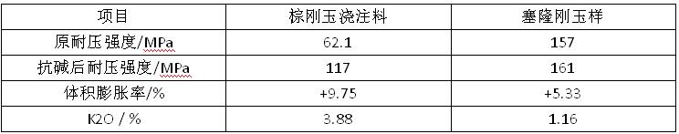由表1可以看出,要獲得相同的作業(yè)性,粗顆粒、中顆粒、細粉質(zhì)量比為58:22:20的5 #配料用水量較少,各項物理指標也較好。也即增加顆粒的加入量可以提高澆注料的密度。 2.2 α-AL2O3微粉種類選擇和加入量 以5#配比為基礎,試驗選用編號為y、s、z、b、j、c的六種α-AL2O3,微粉做對比試驗,這六種α-AL2O3微粉的粒徑分布和比表面積各不相同。采用的六種微粉盡管粒徑分布不同,比表面積各異,但配制的澆注料的物理性能都能滿足預期要求。相比之下,含微粉 c的配料用水量更小些(3.3%),各項物理指標也較好些。當選用α-AL2O3微粉c,加入量為3%~6%時,配料用水量相同,并且試樣的物理指標也在目標值內(nèi)。 2.3 uf-si02,種類選擇和加入量 本試驗選用國產(chǎn)微粉和埃肯微粉做對比試驗,國產(chǎn)uf-siO2配料用水量3.5%,?蟯f-Si02配料用水量3.3%。澆注料的物理性能見表2?梢钥闯觯_到相近的流動性,用國產(chǎn)uf-si02時,施工用水量多于用埃肯uf-SiO2的用水量,試驗的各項物理指標都不如用進口微粉的試樣。更為嚴重的是,因為國產(chǎn)微粉雜質(zhì)含量高,1 500℃燒后試樣發(fā)生鼓脹變形,而加進口微粉的試樣1500℃燒后試樣外觀規(guī)整。為了制得質(zhì)量優(yōu)良的預制塊,決定采用?系膗f—Si02。 試驗選用?衔⒎鄣募尤肓繛3%、4%、5%、6%、7%做對比試驗,試驗結(jié)果列于表3。由表3可以看出,當uf—Si02加入量為3%一4%時,施工用水量較大,燒后線變化也較大,當加入量為5%~7%時,施工用水量較小,各項指標也在目標值內(nèi)。 2.4水泥種類和加入量 剛玉預制塊由于位于陶瓷杯中心和風口部位,為保證其良好的高溫性能,由配料引入的ca0必須小于0.5%,所以該澆注料應為性能優(yōu)良的超低水泥澆注料。試驗選用CA一75G和Seacar71兩種純鋁酸鈣水泥做對比試驗,加入量在0.5%~1.5%。結(jié)果發(fā)現(xiàn),兩種水泥當加人量為O.5%~1.5%時,各項物理指標都能滿足要求。但前者雜質(zhì)略高于后者,后者性能較為穩(wěn)定,故決定采用seacar71水泥。 2.5配比確定 選用粗顆粒、中顆粒、細粉質(zhì)量比為58:22:20,其中α-AL2O3,微粉加入量為6%,uf-Si02加人量為6%,seacar71水泥加入量為l%制備了棕剛玉澆注料。 棕剛玉澆注料的抗渣結(jié)果為:切開坩堝,無明顯的浸蝕滲透現(xiàn)象。 從抗堿試驗來看,剛玉莫來石樣完全潰散,無一完整的。賽隆剛玉樣與棕剛玉澆注料試樣完整無裂紋,其抗堿性試驗結(jié)果見表4。棕剛玉澆注料有較好的抗堿性能,但與賽隆剛玉樣相比,抗渣試驗后體積膨脹較大,吸收的K2O也較多。