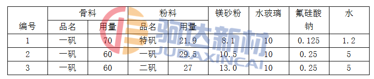 鋼包鋁鎂澆注料的耐火骨料,一般用特級(jí),一級(jí)或二級(jí)礬土熟料,其最大料徑為15~17mm,顆粒級(jí)配;>10mm,27%;10~5mm,39%;5~3mm,19%;3~0.09mm,15%;耐火粉料特級(jí)或一級(jí)礬土熟料制取,細(xì)度為小于0.09mm的占95%以上;水玻璃模數(shù)為2.8~3.3,密度為1.4~1.45g/cm3,另加2%~5%的潔凈水,實(shí)際配料時(shí)水玻璃密度約為1.33g/cm3;采用氟硅酸鈉作促凝劑,其用量占料總質(zhì)量的0.08%~0.3%,鎂砂粉中MgO>90%,其細(xì)度為小于0.09mm的應(yīng)大于95%。鋼包鋁鎂質(zhì)澆注料的通用配合比見(jiàn)表1-1。