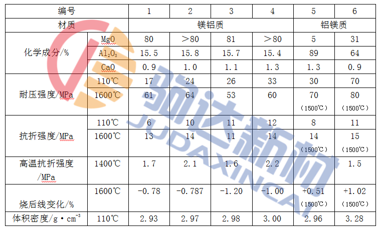 高純鎂鋁(鋁鎂)質耐火澆注料的性能,見表1-1。耐火骨料臨界粒徑為8mm或5mm。編號1~編號4用的耐火骨料為MgO97%的電熔鎂砂,用量為65%,耐火粉料也為電熔鎂砂粉,用量為21.5%;編號1用的電熔剛玉粉小于0.088mm的為10.5%、超微粉為3%;編號2~編號4用的電熔剛玉粉小于0.088mm的8.5%,編號2用其超微粉5%。編號3和編號4則用α-Al2O3超微粉5%。剛玉和α-Al2O3超微粉的比表面積分別為26m2/g和36m2/g;編號5用的骨料為致密白剛玉,白剛玉和α-Al2O3作耐火粉料,同時添加5%的高純燒結鎂砂(MgO97.6%)粉;編號6用的耐火骨料為Al2O390%的特級礬土熟料34%、高純電熔鎂砂粉30%和鋁鎂尖晶石4%。耐火粉料為剛玉粉和MA粉、α-Al2O3和SiO2超微粉。結合劑為CA-80水泥,并摻加適量外加劑;編號1~編號5用的結合劑為CA-70水泥,其用量約為4%。按材料配合比要求,加減水劑0.15%,水用量為5%~6.5%,成型制樣,自然養護。養護3d后檢驗常溫耐壓強度,一般為6~16MPa。