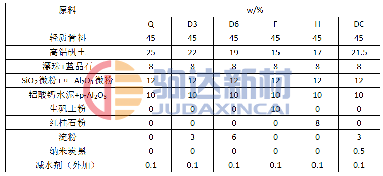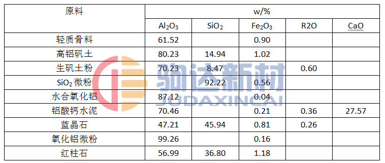 試驗用原料有:合成輕質骨料、高鋁礬土熟料、漂珠、藍晶石、二氧化硅微粉、氧化鋁微粉、純鋁酸鈣水泥、以及造孔劑生礬土粉、紅柱石、淀粉、納米炭黑等。原料的化學組成見表1。