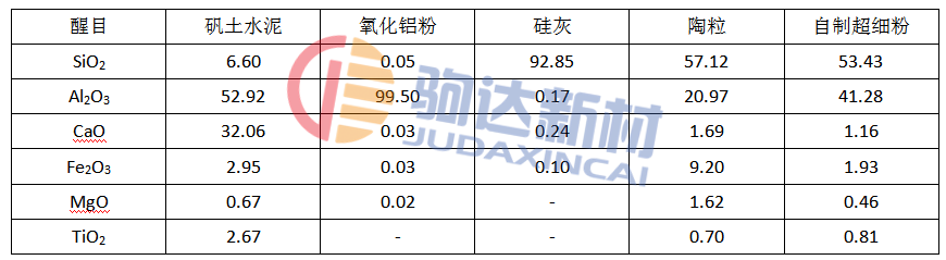 試驗(yàn)用原材料為礬土水泥,陶粒,氧化鋁粉,硅灰,自制超細(xì)粉(粘土質(zhì)),分散劑等。其化學(xué)成分如表1。