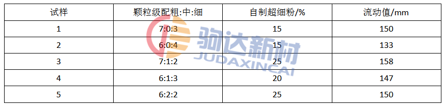 骨料對(duì)流動(dòng)性的影響表現(xiàn)在多方面:顆粒形狀,級(jí)配,粒徑,吸水性等。顆粒的形狀愈接近球形,顆粒間相互接觸的面積愈小,流動(dòng)性愈好。骨料的吸水性小,則混合料用水量在較小的情況下就足以保證形成溶膠并使顆粒之間能夠自由流動(dòng)。顆粒級(jí)配是影響流動(dòng)性能的重要因素。該試驗(yàn)中顆粒范圍為:粗顆粒5〜1.2 mm;中顆粒1.2〜0.3mm;細(xì)顆粒0.3〜0.045mm;超細(xì)粉< 0.045mm。細(xì)粉用量不足時(shí),骨料與細(xì)粉之 間存在著分離傾向,流動(dòng)性差或不流動(dòng);中顆粒用量較多時(shí),因骨料之間的直接接觸,使流動(dòng)性顯著下降;細(xì)粉用量過多時(shí),則施工后細(xì)粉產(chǎn)生分離現(xiàn)象,或產(chǎn)生高粘度,影響流動(dòng)性。采用不同的粗中細(xì)顆粒級(jí)配,觀察其相應(yīng)的達(dá)到穩(wěn)定的流動(dòng)性時(shí)所需的超細(xì)粉最小用量,試驗(yàn)結(jié)果見表3。