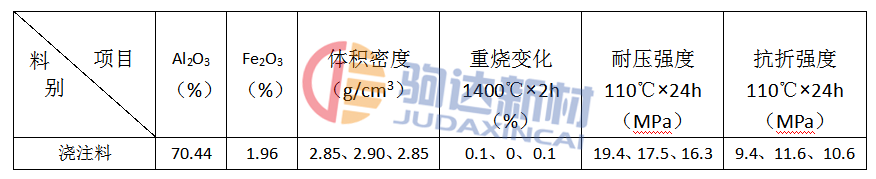高鋁磷酸鹽耐火澆注料是采用PA-80膠結合的澆注料。它具有高強快硬、粘結強度大、施工周期短的優點,是熱工窯爐搶修澆注、冷補、熱補常用的耐火材料(表1)。