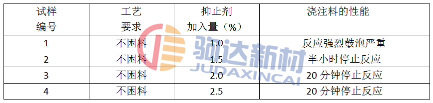 高鋁磷酸鹽澆注料采用不困料。添加抑止劑是項施工新工藝,但關鍵是控制好抑止劑的加入量。我們以高鋁礬土為原料(Fe2O3<1.5%),以江蘇武進生產的PA-80膠作結合劑,反復實驗抑止劑適宜的加入量為2~2.5%,試驗情況見表4。