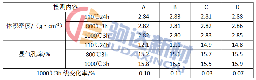 由表3結果,減少純鋁酸鈣水泥的用量,試樣的烘干強度也隨之降低,表明在常溫下試樣的強度主要由純鋁酸鈣水泥提供。用活性α—Al2O3替代部分煅燒α—Al2O3,可使其在較低溫度下發生水化或與體系中的SiO2發生反應生成莫來石,與純鋁酸鈣水泥共同作用提高了樣品的耐壓強度及高溫抗折強度,表現為A和B配方結果之差。添加廣西白泥,其礦物成分主要是高嶺石,使體系在800℃左右開始出現液相。促進澆注料體系在中溫下的燒結,表現為C配方具有較高的1000℃燒后冷態強度;D配方含有較高的活性α—Al2O3微粉和較低的水泥用量,因此其1000℃以下的強度較低,但其1000℃熱處理后的冷態強度提高顯著,可能因為水泥水化物比較少,加入引起的水化物結構變化及體積變化比較小,同時活性α—Al2O3微粉及SiO2微粉與純鋁酸鈣水泥共同作用形成的網狀結構可以保持其形狀至較高溫度,高溫下其與體系中其他物質的反應程度也比較高,從而提高了樣品經1000℃熱處理后的冷態強度。表4是各配方樣品不同熱處理溫度后的體積密度、縣氣孔率加熱永久線變化的結果。