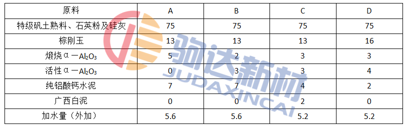 表2 熔鋁爐用耐火澆注料實驗配比(w) %