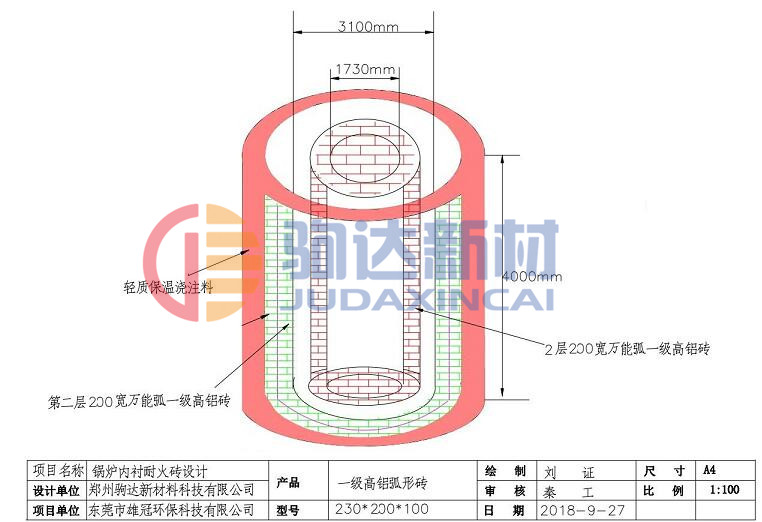 我公司是專業(yè)從事耐火材料的生產(chǎn)制造與窯爐的設計安裝工作,主要生產(chǎn)耐火磚有高鋁材質(zhì)、粘土材質(zhì)、剛玉材質(zhì)、碳化硅材質(zhì)和輕質(zhì)隔熱耐火磚等耐火材料,近期我公司收到東莞雄冠環(huán)保科技有限公司,發(fā)來的30t熱解爐使用耐火材料的分布圖并希望能夠得到我公司在材料與設計安裝上的支持,收到相關(guān)資料后我公司設計安裝部門進行了核對,并繪制相關(guān)使用的萬能弧耐火磚的設計砌筑方法。雄冠環(huán)保提供的熱解爐相關(guān)資料。