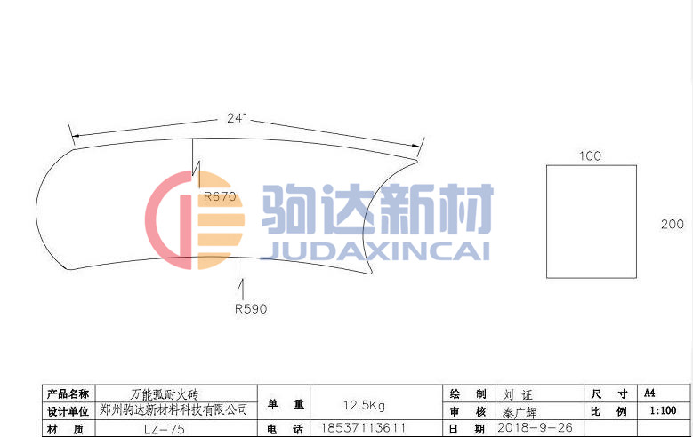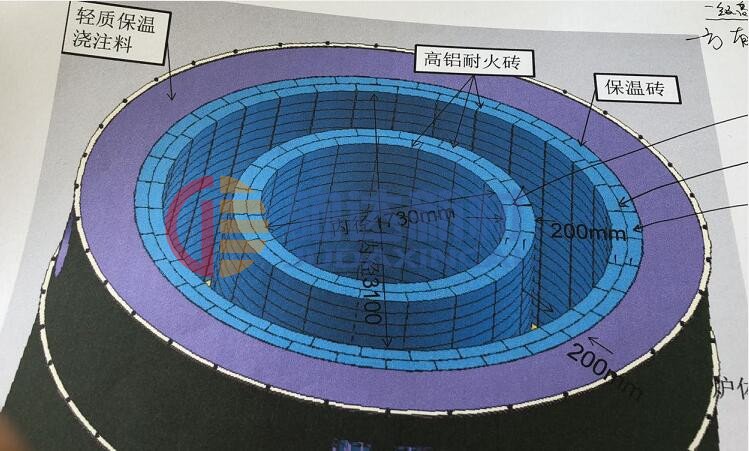 我公司根據(jù)相關(guān)資料設計內(nèi)襯耐火材料使用的磚型為萬能弧耐火磚,改雙層壁厚為單層壁厚,萬能弧耐火磚型尺寸定為280X200X100(mm),下圖(1)為我公司設計圖紙,砌筑方法為:外層緊貼爐殼為輕質(zhì)保溫澆注料體積密度為1.3g/cm³,內(nèi)層為萬能弧耐火磚,單層砌筑每圈需要數(shù)量為39塊,下圖為設計方案(2)。