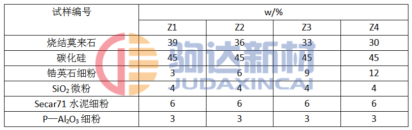固定骨料和基質細粉的質量比為70:30,Z1、Z2、Z3、Z4分別添加鋯英石細粉(w)3%、6%、9%和12%以替代燒結莫來石細粉。試驗配方如表2所示。