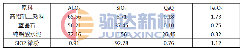 實(shí)驗(yàn)選用二級(jí)高鋁礬土熟料為主要原料,藍(lán)晶石為膨脹劑,純鋁酸鈣水泥和二氧化硅微粉為結(jié)合劑。主要原料的理化指標(biāo)見表1。