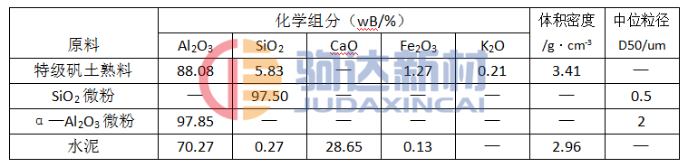 高鋁澆注料所用主要原料有特級礬土熟料、SiO2微粉、α—Al2O3微粉、ρ—Al2O3微粉和純鋁酸鈣水泥,其理化性能指標(biāo)如表1所示。
