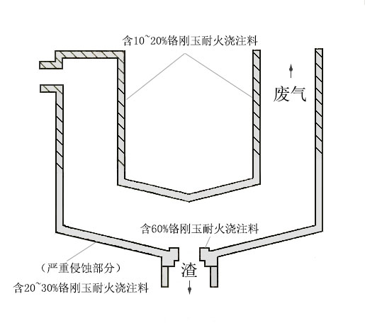 考慮到成本的問題,在實際應用中,廢棄物熔融爐用鉻剛玉耐火澆注料的應用配置如圖1所示。在熔渣侵蝕較為嚴重的部位渣口部位采用鉻含量在60%的鉻剛玉耐火澆注料,在受侵蝕相對較低的下錐段采用鉻含量在20~30%的鉻剛玉耐火澆注料。在熔融爐接近入料口和廢氣口的爐壁采用鉻含量10~20%的鉻剛玉耐火澆注料。