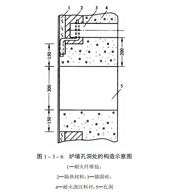 耐火澆注料襯體中的錨固磚布置,必須是直線形的,即橫平豎直布置,以便于振動(dòng)棒在料中行走。從爐底工作面起,高度方向約為500mm處安裝一排錨固磚,再每隔500~600mm安裝一排,依次類推。最上一排錨固磚與爐頂工作面的最小間距為350~450mm;錨固磚的水平中心間距也是500~600mm;遇有孔洞時(shí),其孔洞工作面與錨固磚最近面的間距,一般應(yīng)大于150mm。同時(shí),孔洞周圍均用耐火澆注料進(jìn)行澆灌。也就是說,耐火纖維氈和隔熱材料不得直接接觸火焰,其構(gòu)造見圖2。