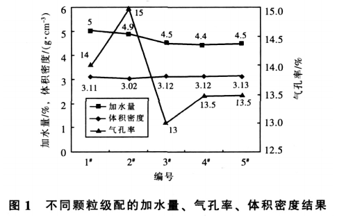 原料是以棕剛玉為骨料,碳化硅、水泥、uf-SiO2、α-Al2O3 為基質,試驗用澆注料的骨料采用≤1mm、1 ~3mm、3~5mm 三級粒度。骨料和粉料的質量比為 63~70∶37~30。澆注料的致密程度和流動性跟顆粒級配密切相關,而最佳的顆粒級配又隨骨料種類、臨界粒度的大小和基質組成的不同而不同,最合適的顆粒級配應該由試驗確定。本試驗選擇5種不同的顆粒級配,細粉部分全部相同,顆粒級配的試驗配方如表2所示。這5個配方的試驗結果示于圖1。