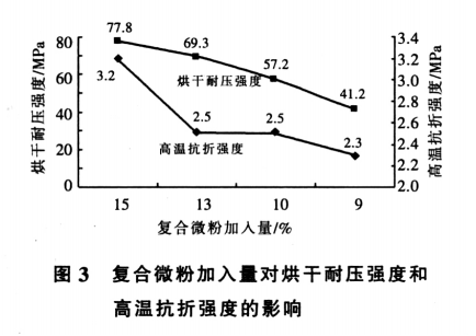 從圖1可知,3#、4#、5# 的顆粒組配較好,再綜合考慮強度指標,決定選擇 3#作為以后試驗的顆粒級配。本澆注料屬于低水泥系列,難點在于既要在1500℃保溫 0.5h 后獲得較高的高溫抗折強度值又要具有較高的烘干耐壓強度。因為烘干耐壓強度主要來源于水泥的水化,為了得到較高的烘干耐壓強度,勢必要加入較多的水泥,而較多的水泥又會使高溫下的液相量增加,使高溫抗折強度下降,前期的試驗工作已經證實了這一點。為了解決這個矛盾, 必須在優化基質上下功夫,也就是uf-SiO2和α-Al2O3 復合微粉的加入量要進行嚴格的控制, 既要發揮uf-SiO2 的結合作用來增加強度,又要控制高溫下的液相量使高溫抗折強度達標。 本試驗將水泥的加入量定為2%,考察復合微粉的加入量對常溫耐壓強度和高溫抗折強度的影響試驗結果示于圖3。