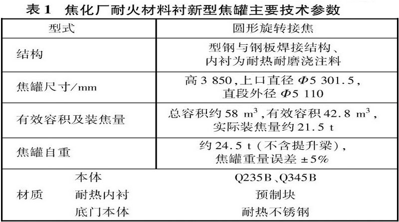 耐火材料襯新型焦罐是在不改變原傳統(tǒng)合金襯板焦罐外形尺寸的前提下,采用耐火材料替代原合金襯板,用整圈鋼板替代原有框架結構的技術。它的特點是根據罐體不同部位的工況采用不同材質的耐火材料內襯和不同的施工工藝。新型焦罐主要技術參數見表1